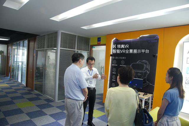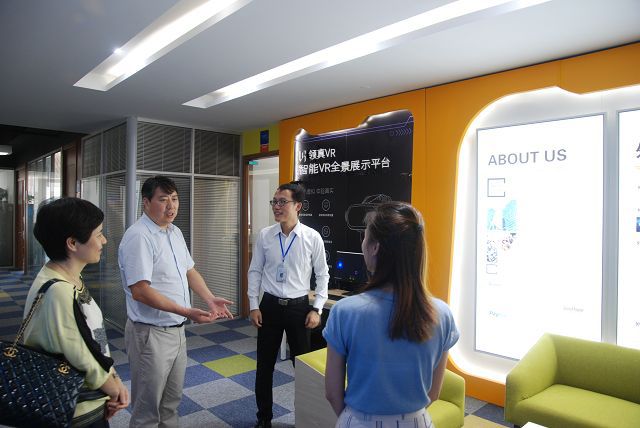 技術(shù)總監(jiān)方勇為領(lǐng)導(dǎo)介紹外貿(mào)快車高科技功能—VR看廠(下圖)