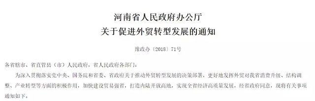 12月10日,河南省政府辦公廳近日印發(fā)《關(guān)于促進(jìn)外貿(mào)轉(zhuǎn)型發(fā)展的通知》,以更好地發(fā)揮外貿(mào)對我省消費(fèi)升級、結(jié)構(gòu)調(diào)整、產(chǎn)業(yè)轉(zhuǎn)型等方面的積極作用,加快建設(shè)貿(mào)易強(qiáng)省,打造內(nèi)陸開放高地,實(shí)現(xiàn)全省經(jīng)濟(jì)高質(zhì)量發(fā)展。
