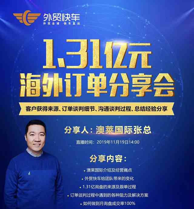 2019年11月,澳萊國際通過外貿(mào)快車簽下單筆1.31億元人民幣,并由10趟專列,共841個集裝箱完成的海外訂單圓滿收官。為此,外貿(mào)快車特組織此次直播分享會,榮幸的邀請到澳萊國際總經(jīng)理張總親自講述1.31億元訂單的來龍去脈,以及如何提升外貿(mào)團隊業(yè)務(wù)水平、提高詢盤成交率、高效獲取訂單等,目的是將澳萊國際的成功經(jīng)驗更廣泛的分享給眾多外貿(mào)企業(yè),以期未來獲取更多大額訂單。