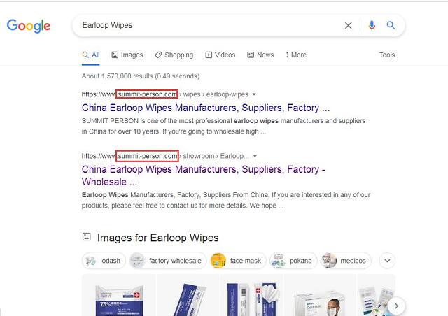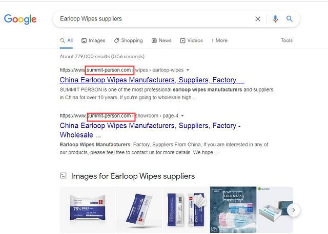 在外貿(mào)快車技術(shù)服務(wù)人員盡責(zé)的指導(dǎo)和巔峰實(shí)業(yè)負(fù)責(zé)人的積極配合下,見(jiàn)效極快,目前已經(jīng)有上百個(gè)重要關(guān)鍵詞活躍在谷歌首頁(yè),甚至不少占據(jù)谷歌首位,以關(guān)鍵詞“Earloop Wipes”、“Earloop Wipes suppliers”為例,只要在谷歌輸入關(guān)鍵詞,輕而易舉就可以找到巔峰實(shí)業(yè)的官網(wǎng),大大增加了品牌曝光度。