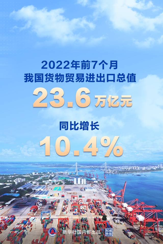 海關(guān)總署最新發(fā)布的數(shù)據(jù)顯示,今年前7個月,我國進出口總值23.6萬億元人民幣,比去年同期增長10.4%。其中,7月份進出口總值3.81萬億元,同比增速進一步提升為16.6%。