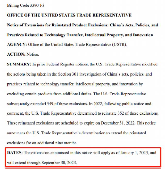 近日,美國(guó)貿(mào)易代表辦公室(USTR)發(fā)布聲明,宣布將原定于2022年底(12月31日)到期的適用于352項(xiàng)中國(guó)產(chǎn)品的關(guān)稅豁免期限延長(zhǎng)九個(gè)月,至2023年9月30日,將于2023年1月1日起生效。