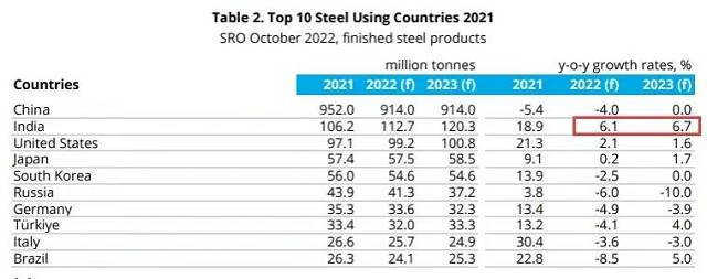 印度鋼鐵需求2022年也出現(xiàn)了類似的高速增長(zhǎng)——預(yù)計(jì)將達(dá)6.1%。目前印度已經(jīng)是僅次于中國(guó)的全球第二大鋼鐵消費(fèi)國(guó)。