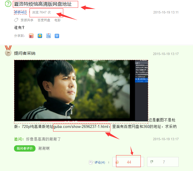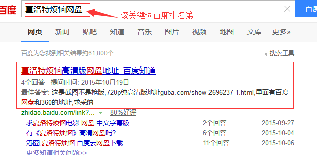 由于百度對于自家產品給予的排名相對較高我們除了在論壇貼吧引流外還選擇了百度知道這一平臺。而在知道中我們的標題用:xxx網盤地址、xxx 高清網盤地址、xxx下載鏈接、求xxxx網盤等等帶上“求”、“網盤”、“鏈接”這樣的詞匯更加符合用戶的搜索習慣,這樣的關鍵詞放在標題中當用戶搜索 相關關鍵詞之后更容易出現在搜索結果中。如圖我這“夏洛特煩惱高清版網盤地址”已經是“夏洛特煩惱網盤”、“夏洛特煩惱高清網盤地址”等關鍵詞搜索結果的 第一位。