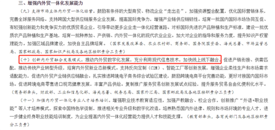 國務(wù)院辦公廳在《關(guān)于促進(jìn)內(nèi)外貿(mào)一體化發(fā)展的意見》中提到:要創(chuàng)新內(nèi)外貿(mào)融合發(fā)展模式,推動內(nèi)外貿(mào)數(shù)字化發(fā)展,充分利用現(xiàn)代信息技術(shù),加快線上線下融合,培育內(nèi)外貿(mào)新業(yè)態(tài)新模式。今年以來,各地更是先后印發(fā)了一系列措施和方案,扎實(shí)推進(jìn)內(nèi)外貿(mào)一體化工作。