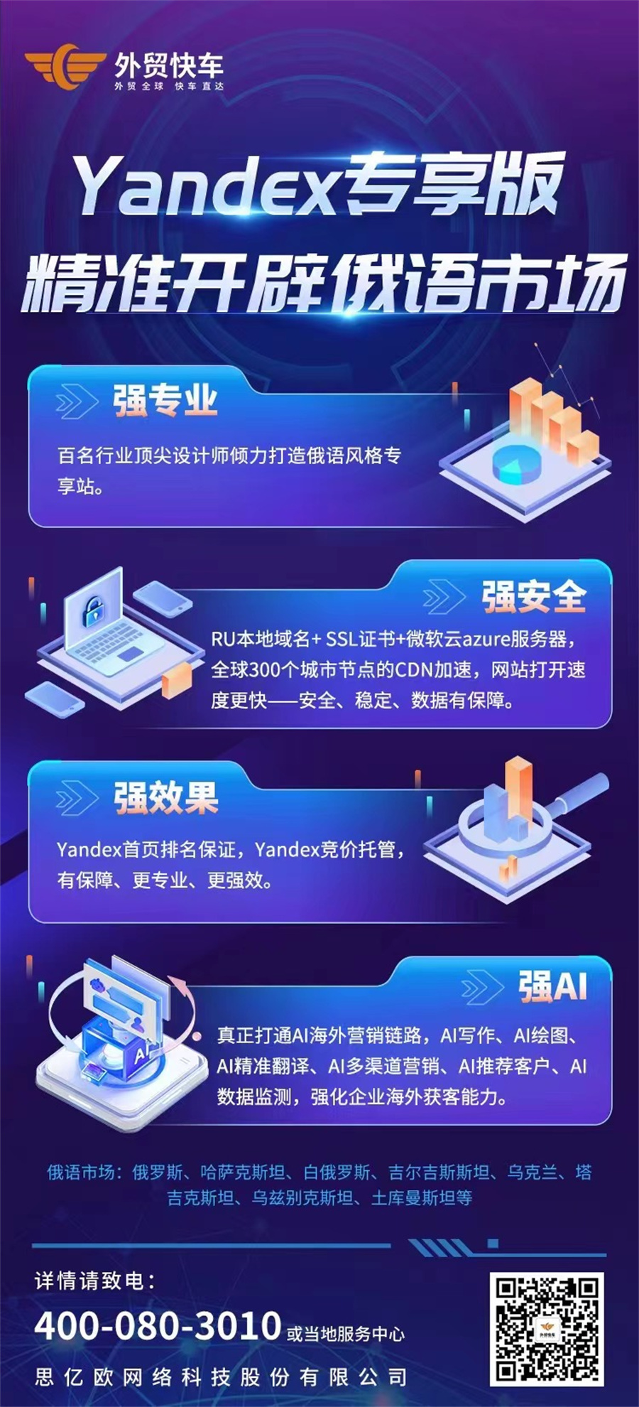 2023年外貿(mào)快車后臺(tái)持續(xù)升級(jí)。新增AI創(chuàng)作板塊,助力外貿(mào)企業(yè)接軌智能數(shù)字營銷;推出外貿(mào)快車6.0項(xiàng)目服務(wù),將效果作出具象化承諾;上線外貿(mào)快車YANDEX俄語專享版,精準(zhǔn)開辟俄語市場。