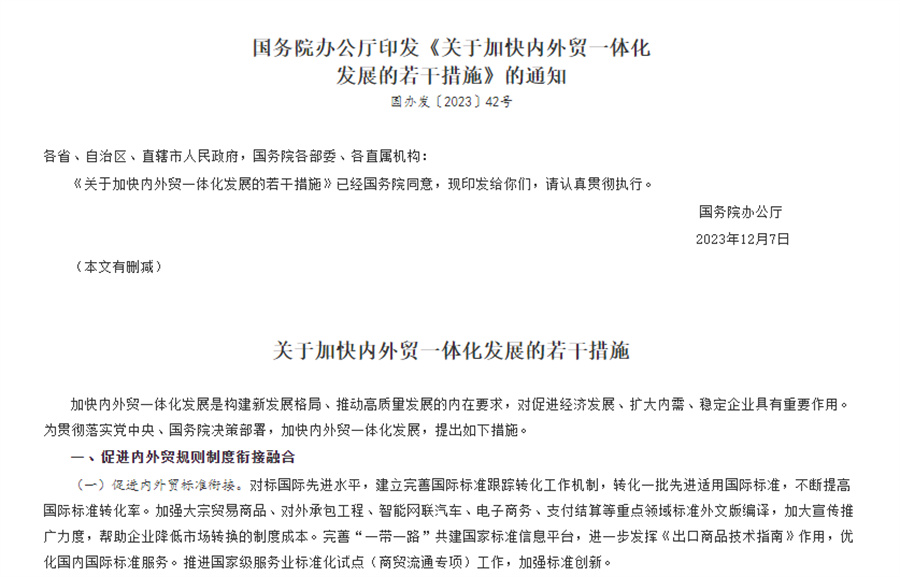 為貫徹落實黨中央、國務(wù)院決策部署,加快內(nèi)外貿(mào)一體化發(fā)展,國務(wù)院辦公廳日前印發(fā)《關(guān)于加快內(nèi)外貿(mào)一體化發(fā)展的若干措施》(以下簡稱《措施》)。《措施》強調(diào),各地方、各有關(guān)部門要積極推進(jìn)各項政策,切實打通阻礙內(nèi)外貿(mào)一體化的關(guān)鍵堵點,助力企業(yè)在國內(nèi)國際兩個市場順暢切換。要優(yōu)化內(nèi)外貿(mào)一體化發(fā)展環(huán)境,加強協(xié)同配合和督促指導(dǎo),確保各項政策措施落實到位,共同促進(jìn)內(nèi)外貿(mào)高質(zhì)量發(fā)展。