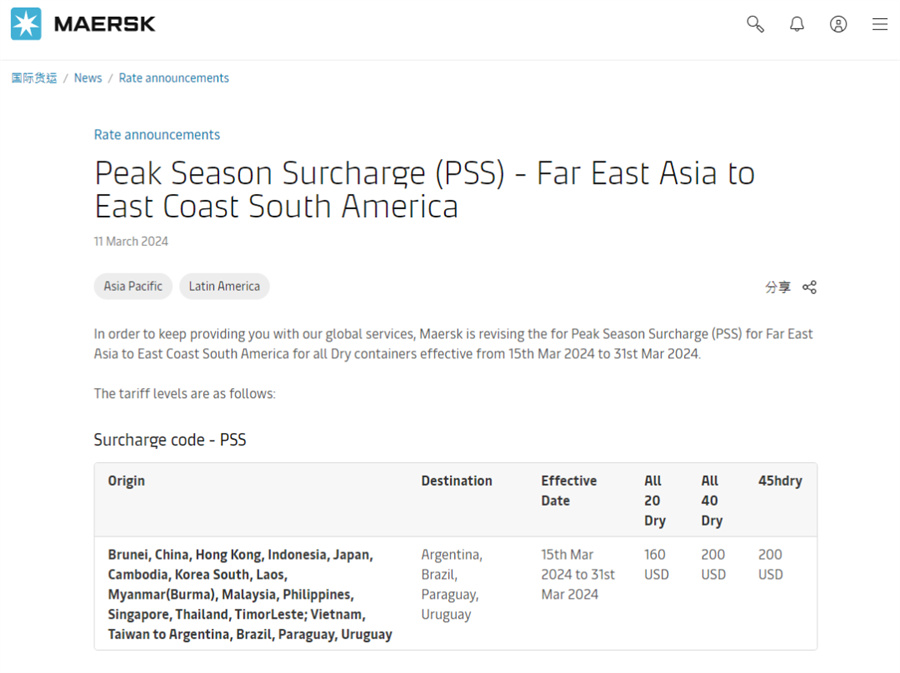 馬士基3月11日發(fā)布公告稱,將收取亞洲至南美東海岸航線旺季附加費(PSS),有效期為3月15日至3月31日。