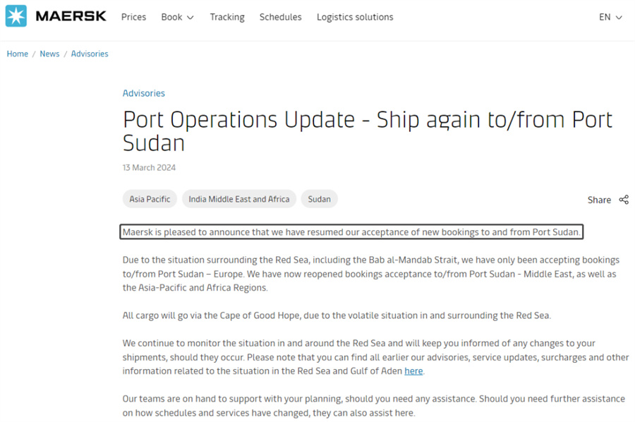 此外,3月13日,馬士基官網(wǎng)發(fā)布通知表示,已恢復(fù)接受往返蘇丹港的新預(yù)訂。