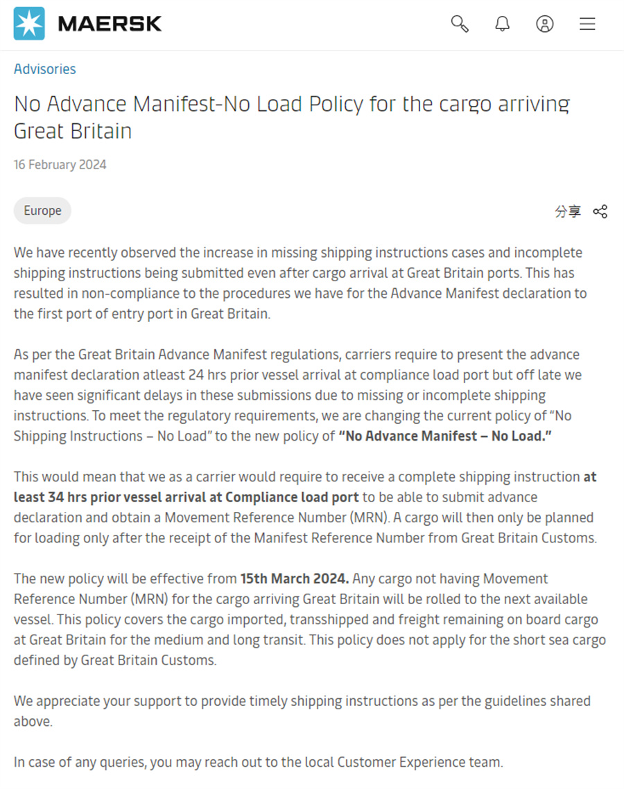馬士基近日發(fā)布公告,宣布已從2024年3月15日起,將在英國實行一項全新的“無預(yù)先艙單-不裝載”(No Advance Manifest - No Load)政策。