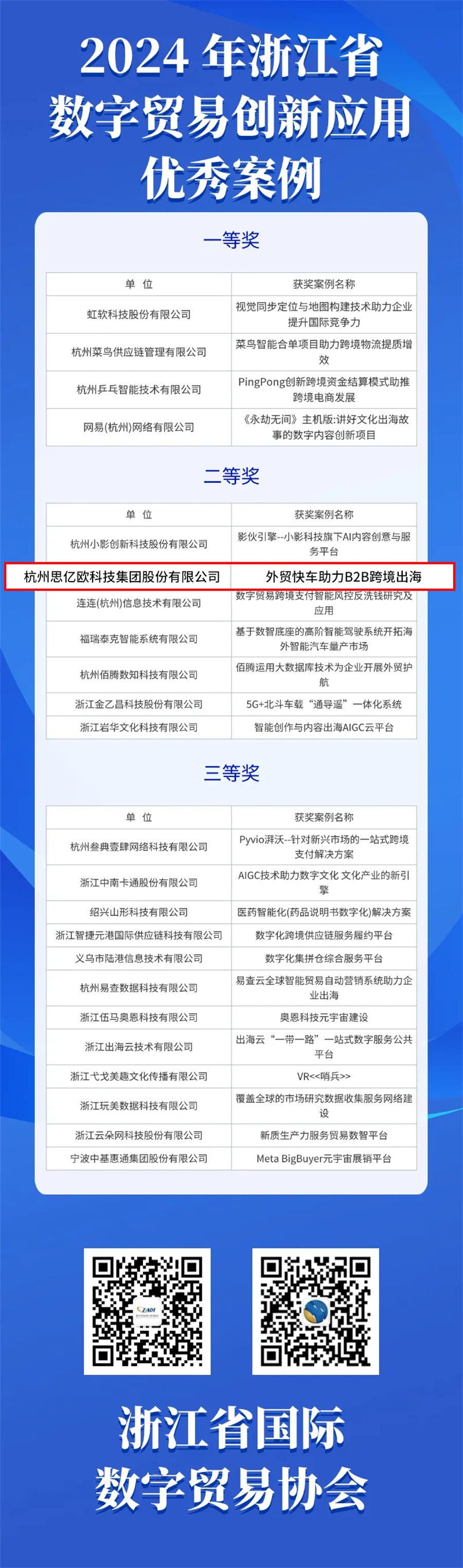 2024年浙江省數(shù)字貿(mào)易創(chuàng)新應(yīng)用優(yōu)秀案例獲獎名單在第三屆全球數(shù)字貿(mào)易博覽會先鋒獎(DT獎)發(fā)布會現(xiàn)場公布。思億歐《外貿(mào)快車助力B2B跨境出海》案例榮獲二等獎。