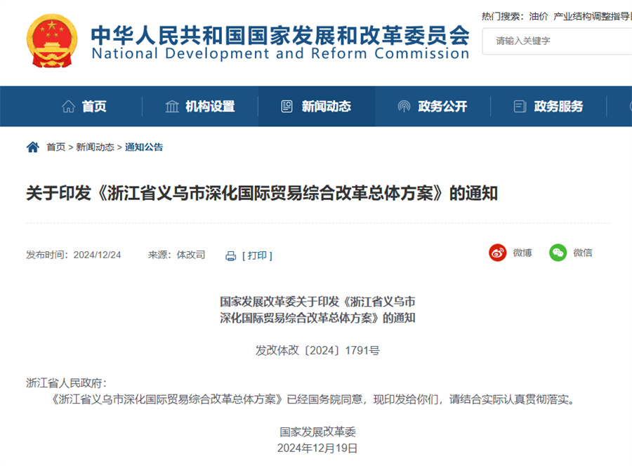 國(guó)家發(fā)展改革委近日印發(fā)《浙江省義烏市深化國(guó)際貿(mào)易綜合改革總體方案》。
