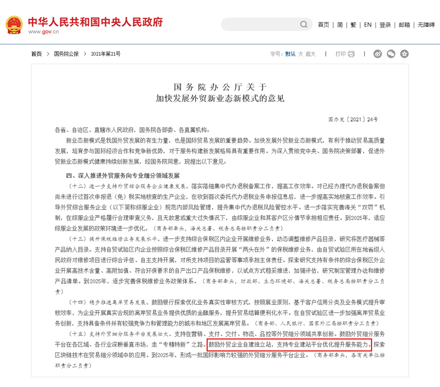 《關(guān)于加快發(fā)展外貿(mào)新業(yè)態(tài)新模式的意見(jiàn)》鼓勵(lì)外貿(mào)企業(yè)自建獨(dú)立站