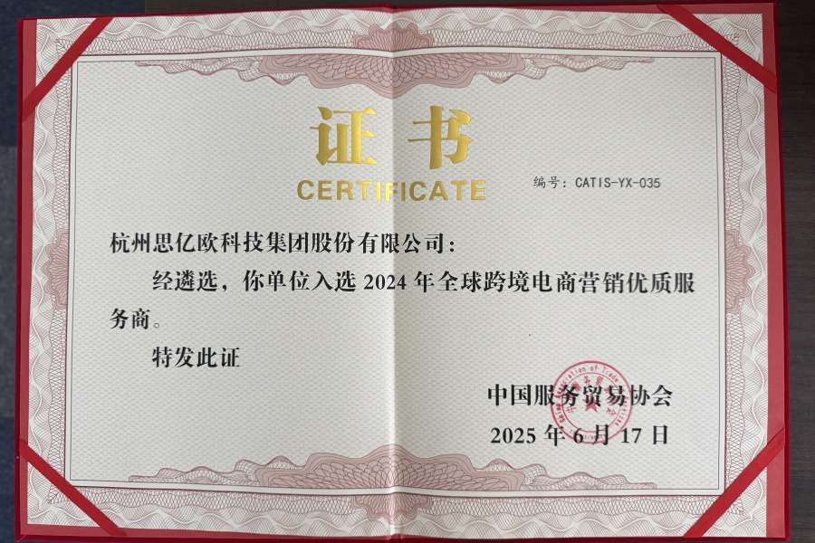 2025年6月17日,“世界跨境電商發(fā)展大會(huì)”在廊坊召開。2025世界跨境電商發(fā)展大會(huì)由世界貿(mào)易網(wǎng)點(diǎn)聯(lián)盟、英中商業(yè)發(fā)展中心、中國服務(wù)貿(mào)易協(xié)會(huì)共同主辦,由中國跨境電商50人論壇、中國服務(wù)貿(mào)易協(xié)會(huì)電子商務(wù)專業(yè)委員會(huì)共同協(xié)辦。杭州思億歐科技集團(tuán)股份有限公司受邀出席2025世界跨境電商發(fā)展大會(huì),并入選為2024年全球跨境電商營銷優(yōu)質(zhì)服務(wù)商。