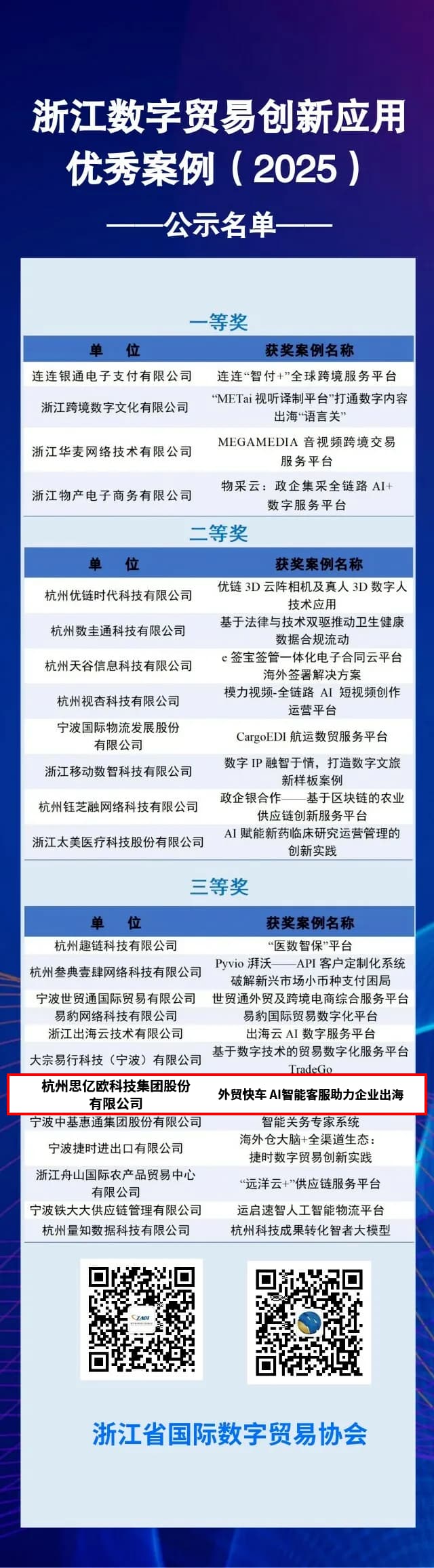 2025年浙江省數(shù)字貿(mào)易創(chuàng)新應(yīng)用優(yōu)秀案例獲獎名單在第三屆全球數(shù)字貿(mào)易博覽會先鋒獎(DT獎)發(fā)布會現(xiàn)場公布。思億歐《外貿(mào)快車AI智能客服助力企業(yè)出海》案例榮獲三等獎。這也是思億歐連續(xù)第二年入選浙江省數(shù)字貿(mào)易創(chuàng)新應(yīng)用案例。