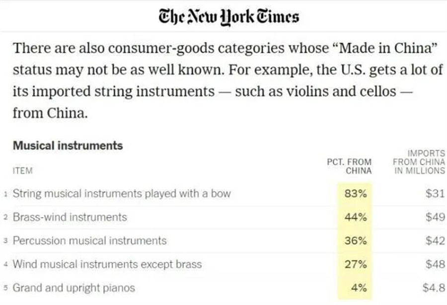 還有一些消費(fèi)品類別的“中國制造”可能不那么廣為人知。例如,美國從中國進(jìn)口了大量弦樂器,包括小提琴和大提琴。維生素及其衍生物也大量從中國進(jìn)口,還有各種冷凍魚類,包括鰻魚、鱈魚、羅非魚等等。