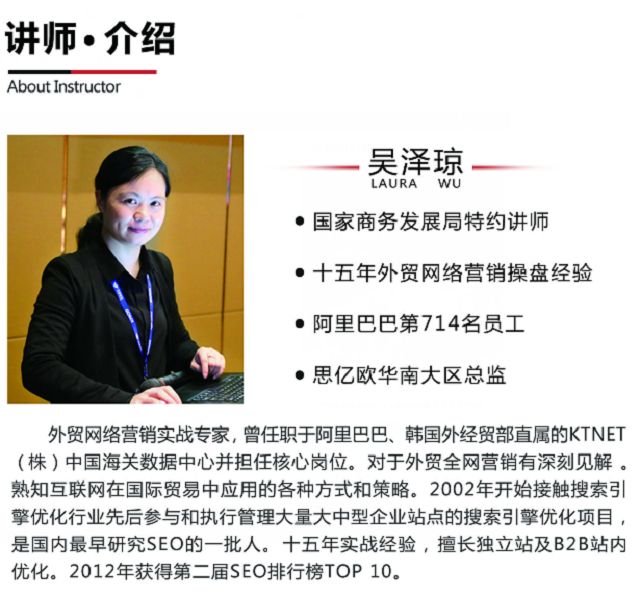 互聯(lián)網(wǎng)+電子商務(wù)時(shí)代是沒(méi)有大小企業(yè)之分這是快魚吃慢魚的時(shí)代,對(duì)于企業(yè)的發(fā)展新渠道大部分的人不是看不見就是看不起又或者是看不懂但更多的是來(lái)不及。如何在快速發(fā)展的互聯(lián)網(wǎng)時(shí)代為外貿(mào)企業(yè)找到發(fā)展的新渠道,主講師吳澤瓊為在場(chǎng)的來(lái)賓進(jìn)行了詳細(xì)的分析,并分享重要干貨。