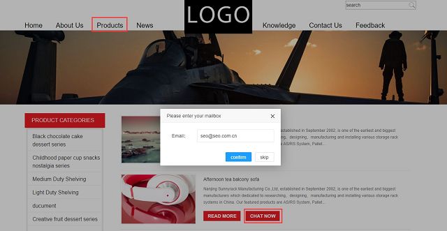 采購商登錄網(wǎng)站,進入網(wǎng)站產(chǎn)品列表(點擊【Product】),點擊【Chat now】,彈出輸入郵箱窗口,點擊【skip】,即可進入實時聊天界面。