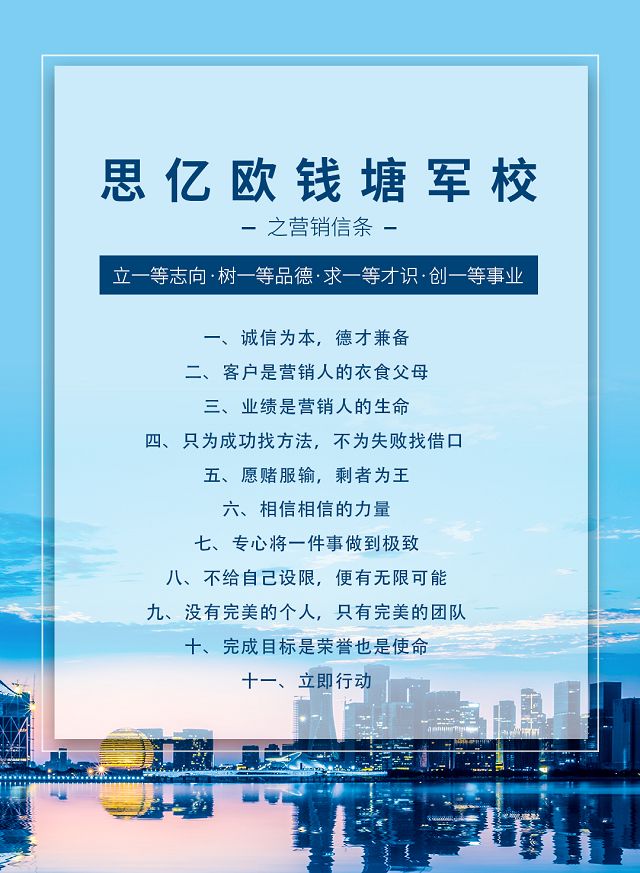 引入軍事化的管理,面向思億歐總部和全國(guó)渠道體系,為從一線營(yíng)銷精英,到中層管理人員,到企業(yè)高管的各級(jí)人群,提供全方位立體化的專業(yè)知識(shí)、技能;管理理論、實(shí)踐;以及態(tài)度、精神和價(jià)值觀的培訓(xùn)。有志于幫助中國(guó)各類型企業(yè)插上互聯(lián)網(wǎng)技術(shù)應(yīng)用產(chǎn)品和服務(wù)的翅膀飛出中國(guó)、飛向全球的思億歐人,通過(guò)思億歐錢塘軍校的系統(tǒng)化培訓(xùn)學(xué)習(xí),必將品學(xué)兼優(yōu),齊心創(chuàng)建思億歐的全新未來(lái)。